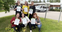 Keskellä vasemmalta: Minna Kivinen, Sarianne Silvennoinen, Tarja Anttila, Sanna Rajamäki ja kouluttaja Virpi Hantikainen.