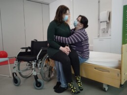 Puolison kanssa avustamme hänet pyörätuolista vuoteeseen päivälevolle.
