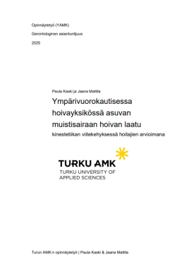 Paula Kasken ja Jaana Mattilan YAMK-opinnäytetyö käsittelee ympärivuorokautisessa hoivayksikössä asuvan muistisairaan hoivan laatua kinestetiikan viitekehyksessä. Hoivan laatua tutkimuksessa arvioivat hoitajat.